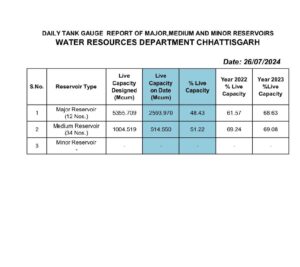 Chhattisgarh News : रायपुर : छत्तीसगढ़ में बांधो में अभी भी, 50 प्रतिशत से कम पानी प्रदेश के 12 बड़े बांधों में 48.43 प्रतिशत पानी