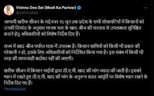 CM Sai X Post : राज्य में खाद-बीज पर्याप्त मात्रा में उपलब्ध है। किसान साथियों को किसी भी प्रकार की परेशानी न हो, इसके लिए अधिकारियों को निर्देशित किया गया है। इस संबंध में किसी भी तरह की लापरवाही बर्दाश्त नहीं की जाएगी।