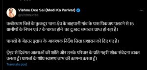 Kawardha Accident : घायलों के बेहतर इलाज के आवश्यक निर्देश ज़िला प्रशासन को दिए गए है। ईश्वर से दिवंगत आत्माओं की शांति और उनके परिवार के प्रति गहरी शोक संवेदना व्यक्त करता हूँ। घायलों के शीघ्र स्वास्थ्य लाभ की कामना करता हूँ।